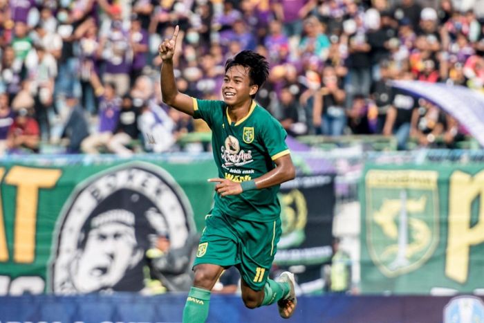 Winger Persebaya Surabaya, Mochamad Supriadi, merayakan gol yang dicetaknya pada laga pembuka Persebaya Surabaya di Piala Gubernur Jatim 2020 yang berlangsung di Stadion Gelora Bangkalan, Madura, Senin (10/2/2020).