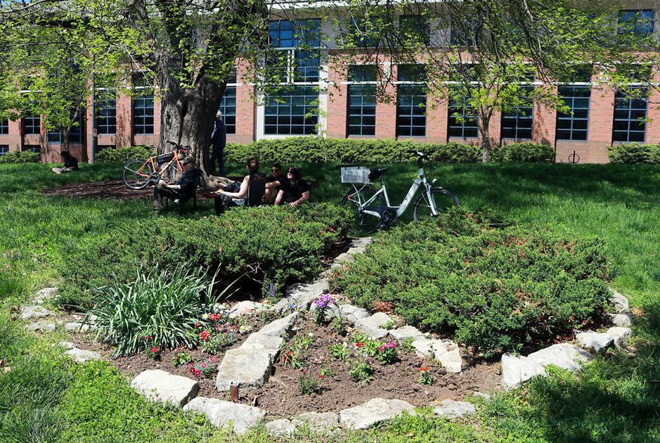 A crowd starts to form Saturday near the peace sign at Peace Park in Columbia. A gathering was held in remembrance of the renaming of McAlester Park to Peace Park 50 years ago following National Guard shootings at Kent and Jackson State Universities.
